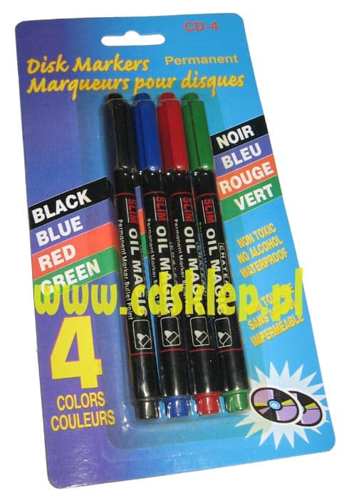 Zestaw 4 różnokolorowych pisaków do płyt CD idealnych do opisywania płyt CD, kopert foliowych (również papierowych), pudełek plastikowych. Pisaki są wodoodporne i niezmywalne.